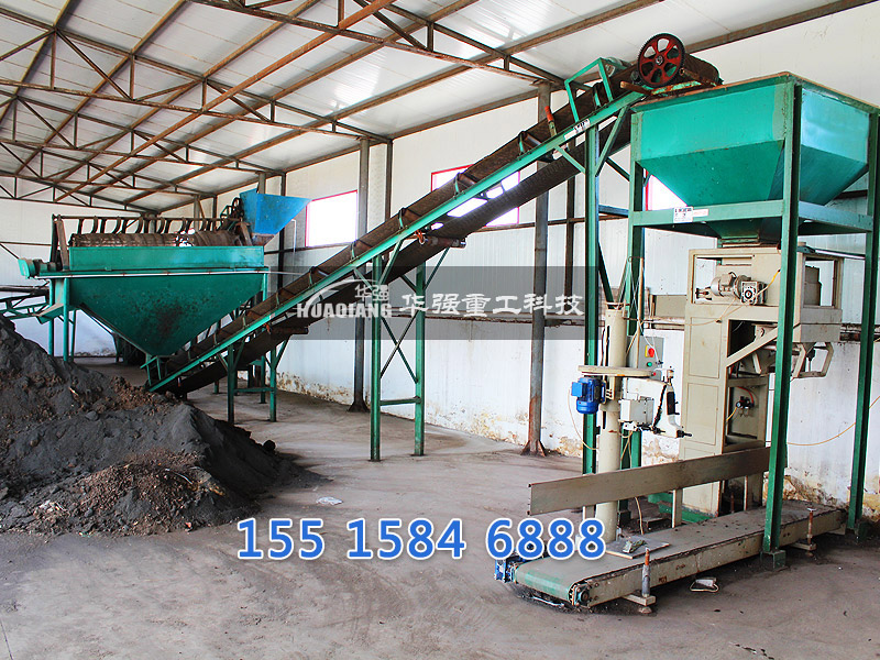 進一步對堆肥成品進行篩分,篩下物根據水分含量高低分別進行處理。篩下物造粒后,送入由沼氣池沼氣供熱的烘干機,進行烘干,按比例添加中微量元素后攪拌混合后制成成品,進行分裝,入庫待售。篩上物返回粉碎工序進行回用。