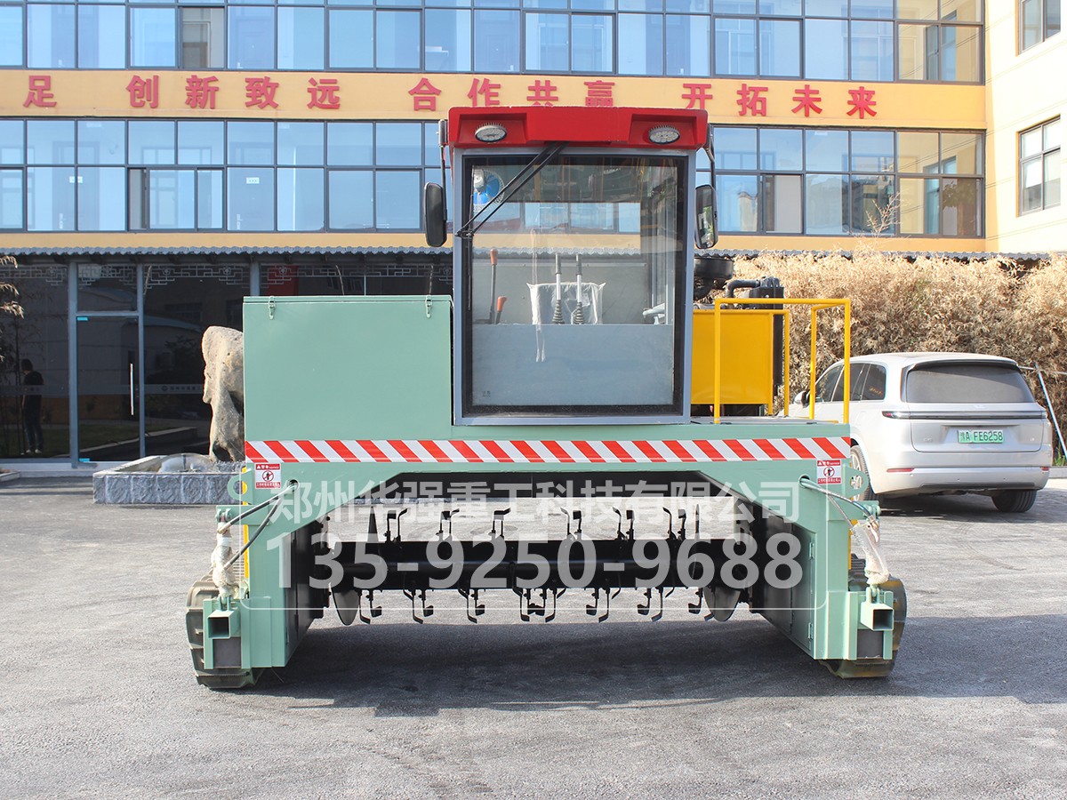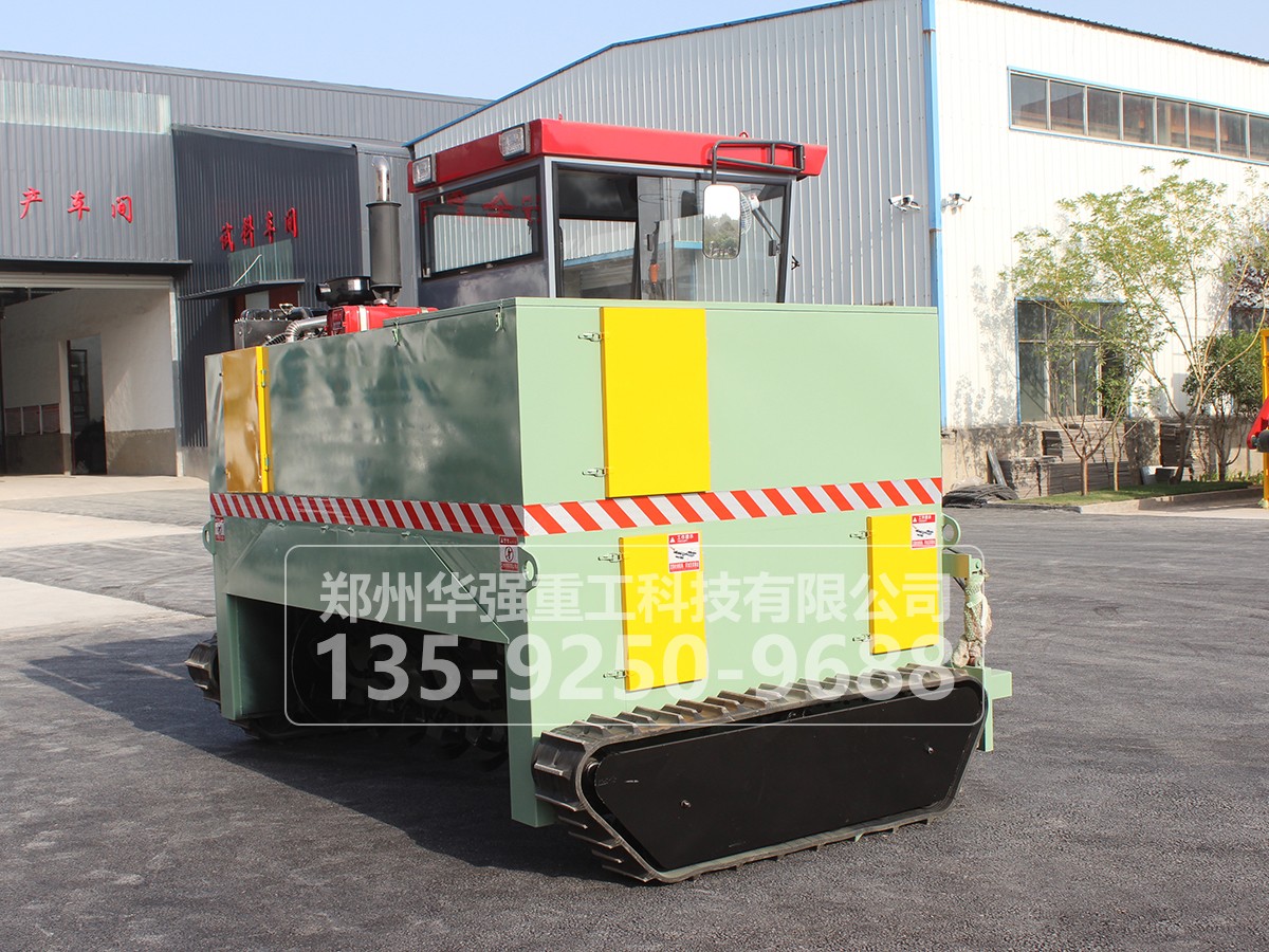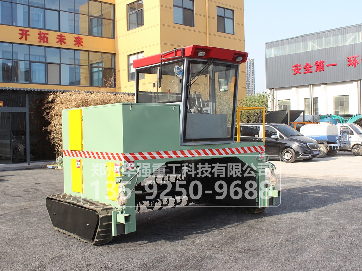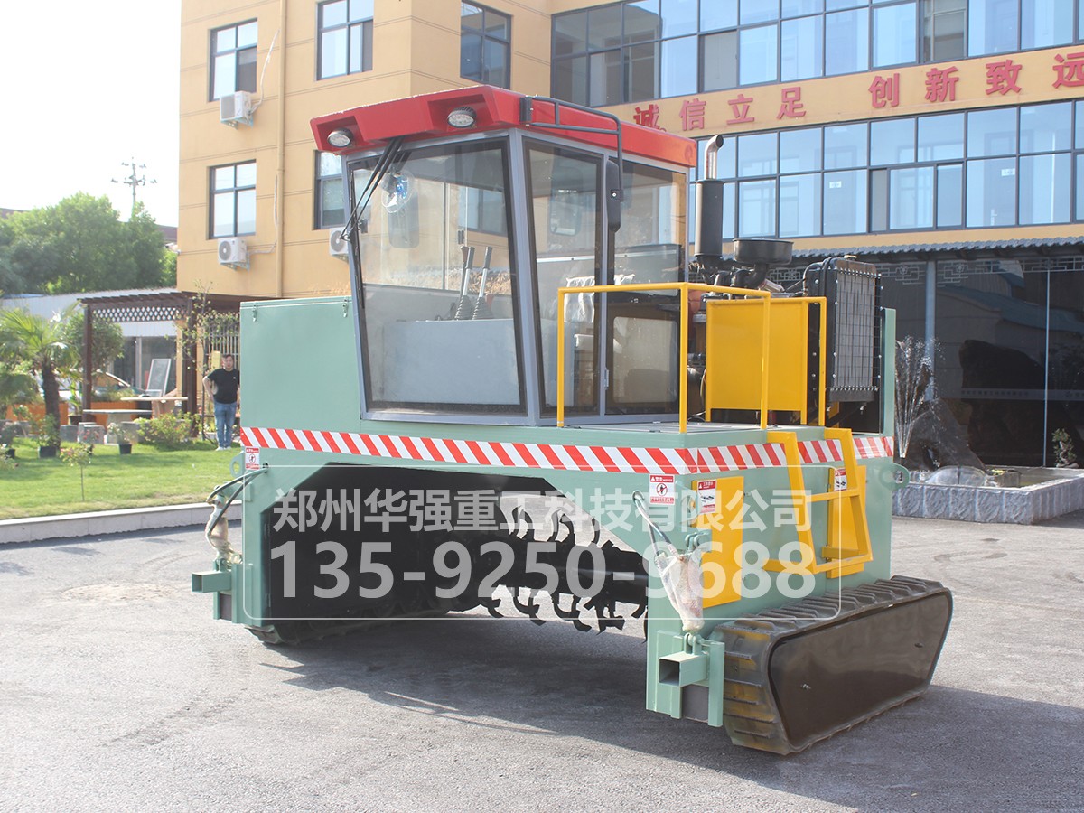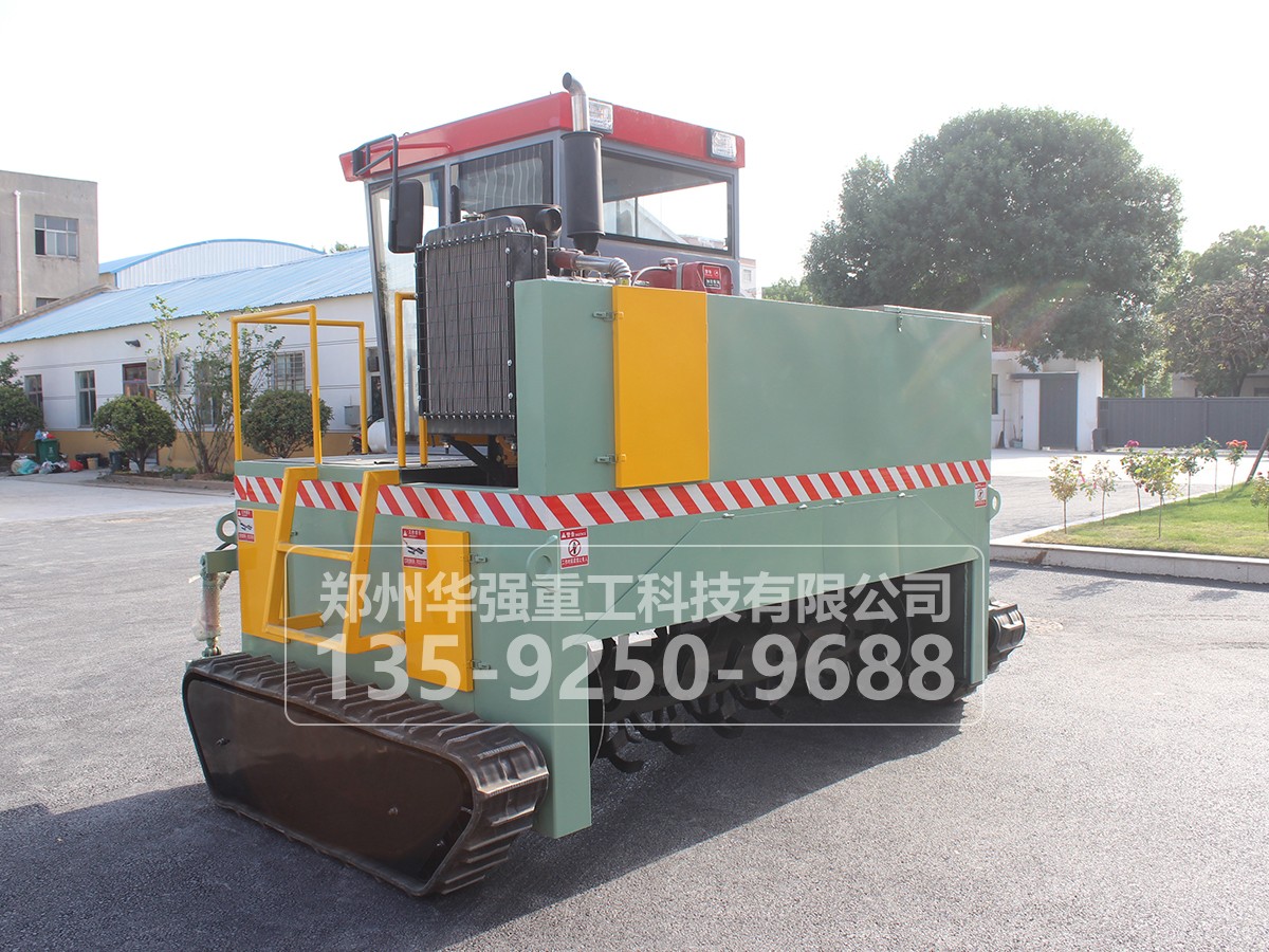 履帶式翻拋車采用履帶式設計,可前進、倒退、轉彎,由一人操控駕駛。行駛中整車騎跨在預先堆置的長條形堆體上,由機架下掛裝的旋轉刀軸對堆體原料實施翻拌、蓬松、移堆,車過之后篡成新的條形垛堆。即可在開闊場地,也可在車間大棚中實施作業。