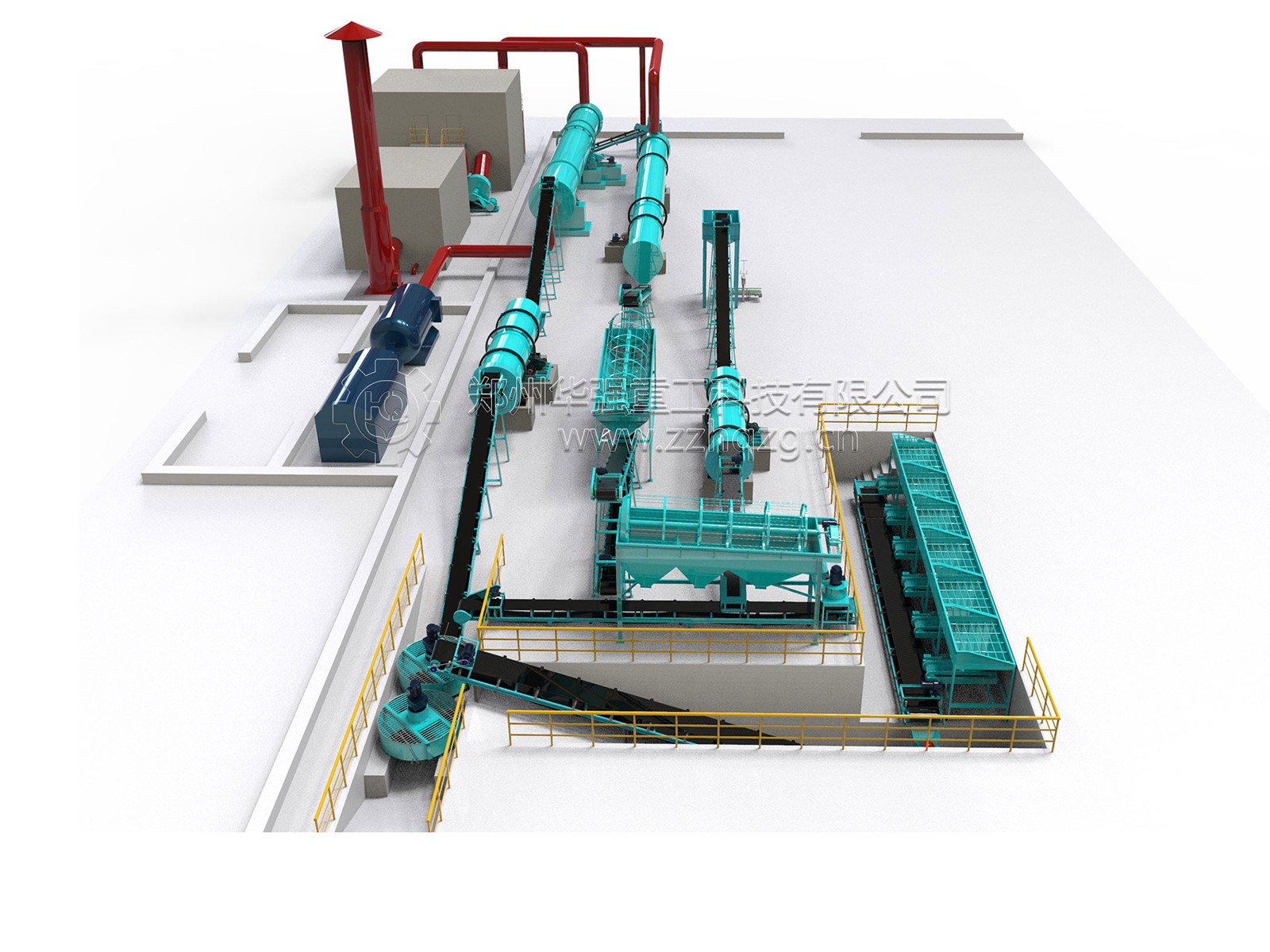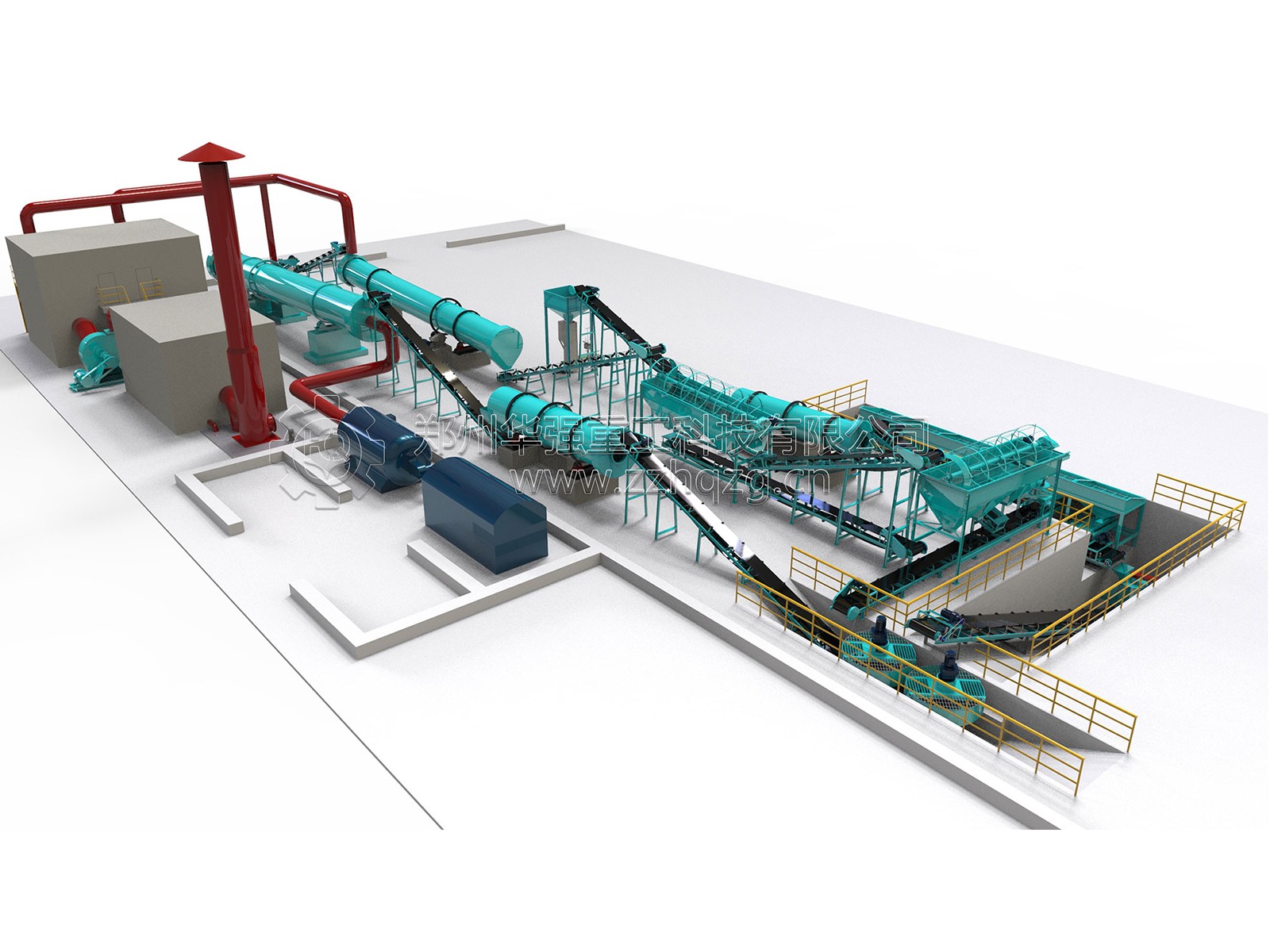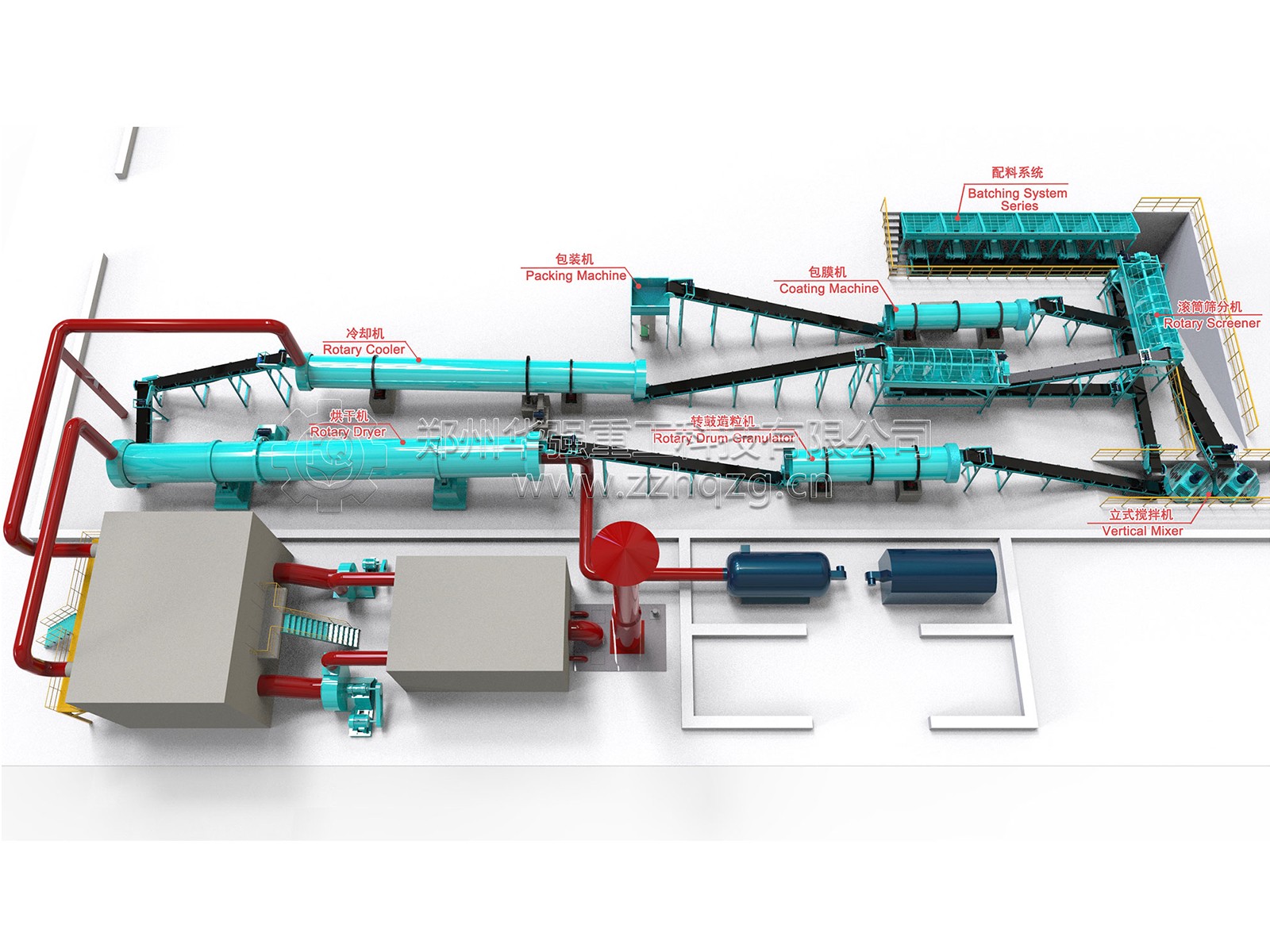 工藝流程:配料系統——滾筒篩分機——立式攪拌機——轉鼓造粒機——烘干機——冷卻機——自動包裝機。